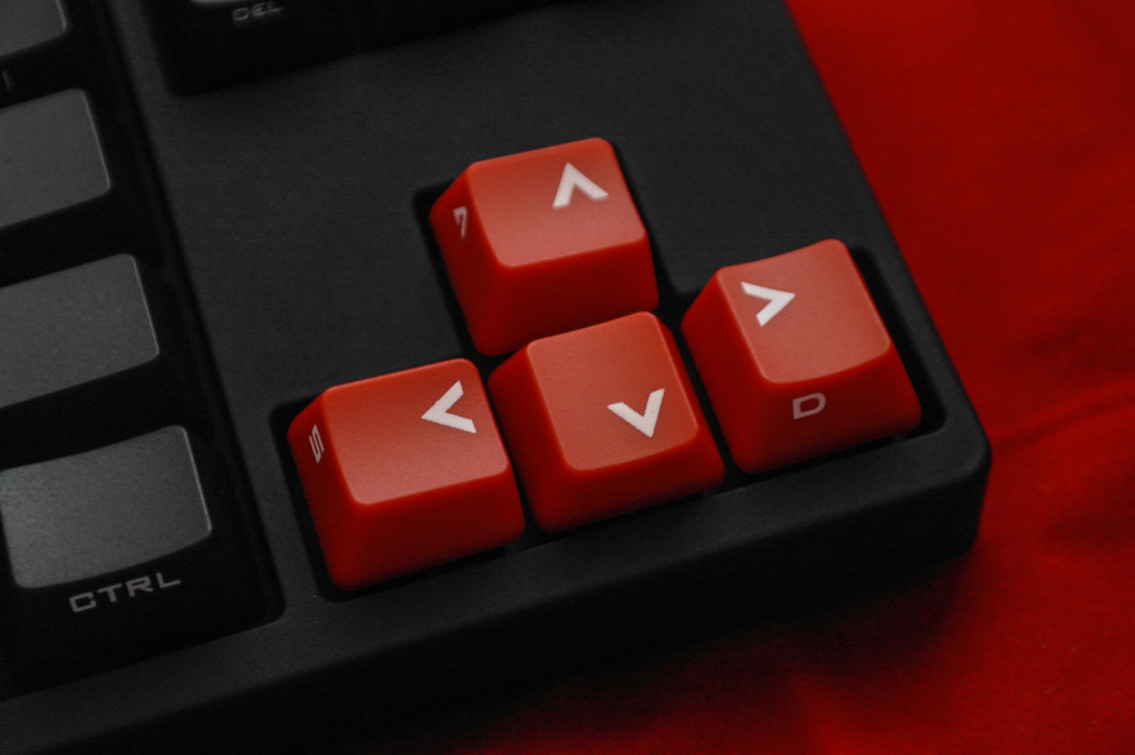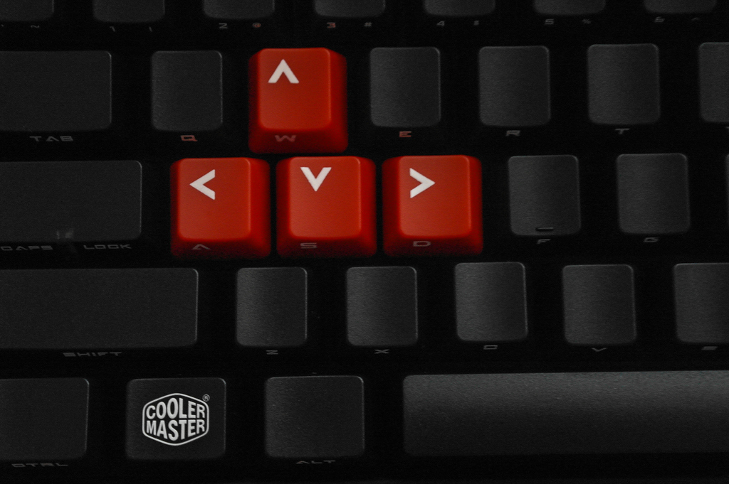 Last but not least we have the replacement keys. The two “Cooler Master” branded keys simply replace the Windows keys at the bottom. The WASD or arrow keys can be replaced with the four red ones; I would recommend using them for WASD only as they look a bit awkward and feel a bit too close when substituting for the arrow keys: