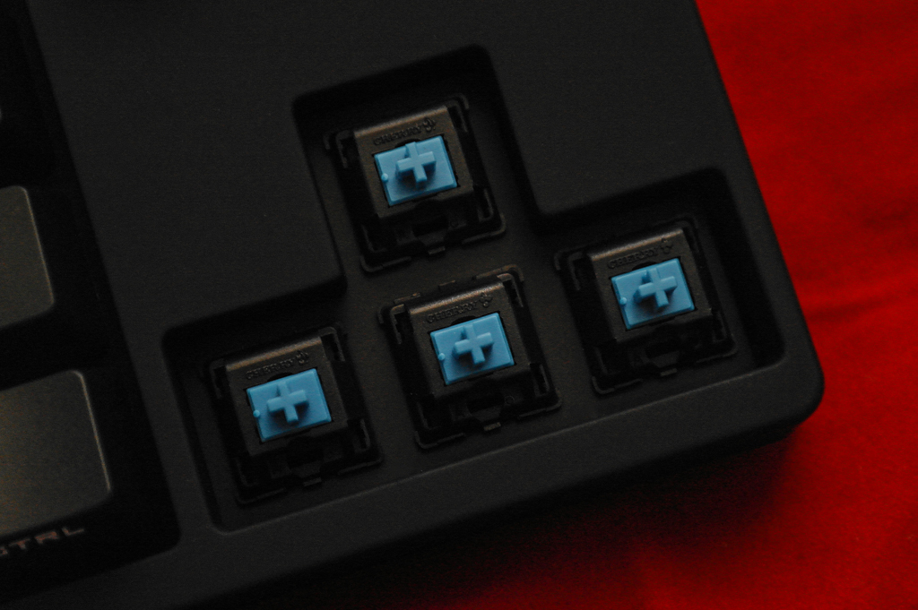 The Cherry MX Blue switches on the other hand require about a 40% depression until the point where you hit the actual switch, at which point the key will register. In total, you’re looking at about a 60% depression rate for feedback; the precise tactile response is excellent. This makes the Blue’s excellent for typing, incrementally so for those who are novices and are coming from membrane keyboards where there is a tendency to round-out when typing and go all the way down. The clicky sound will be extremely loud, but the overall experience will be softer, smoother, and overall more enjoyable on your fingers.
