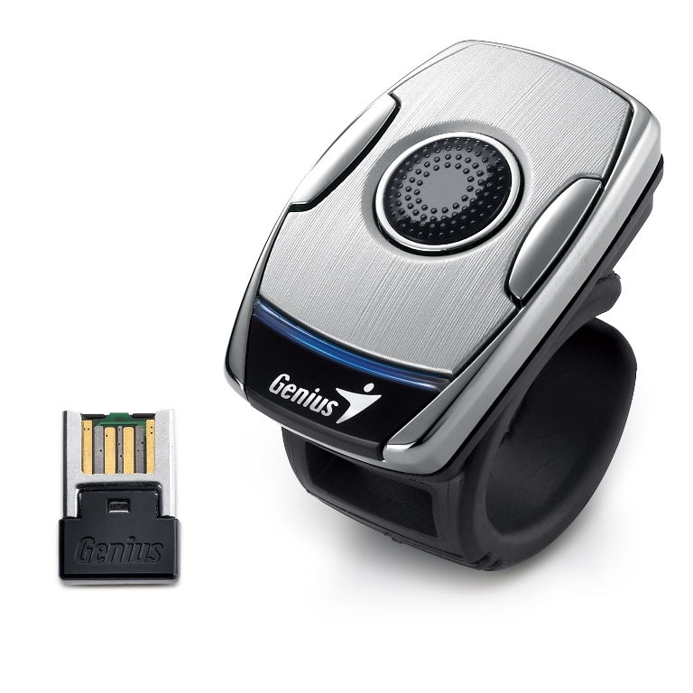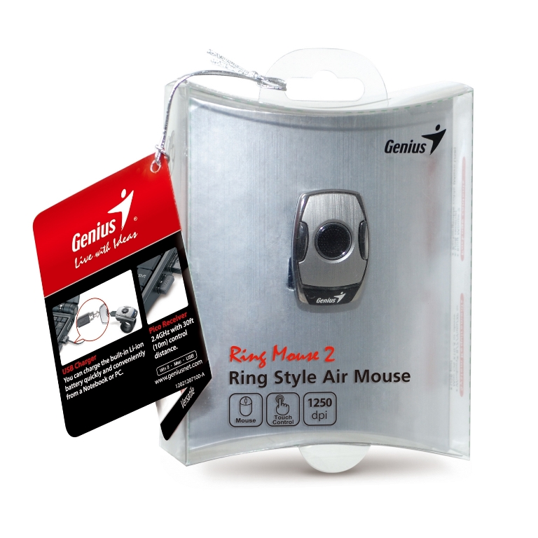 The Genius Ring Mouse 2 has a rubber ring design giving more comfort and a better finger grip. The ring also serves as a storage unit for the USB pico receiver when moving from place to place. The outer appearance has also been updated giving it a more modern sleek design. For users that want to match color with style the Ring Mouse 2 is available in two colors: silver and titanium.