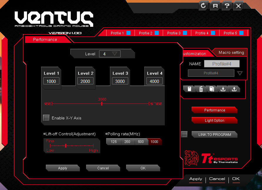 In the VENTUS program you can customize the mouse DPI settings to four levels, from 500 to 5700 DPI, and you can create up to five different profiles. In each profile you can cycle through four different DPI settings. You can name each profile by their intended use and you’ll be able to switch through them by clicking the top button, just below the scroll wheel.