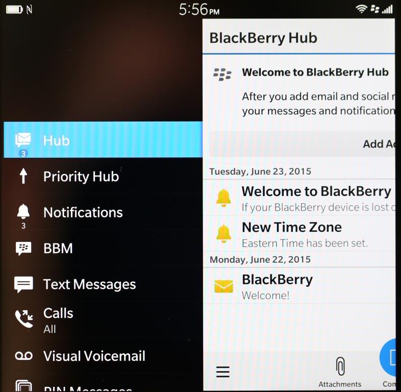 We covered our BB10 explanation in our Blackberry Z30 Report, but it merits mentioning once again as it clearly demonstrates how much easier it is to navigate than any other on the market today. The Blackberry 10 OS is manipulated through four screens, each of which can be found by swiping left or wipe on the screen. To the far left is the Blackberry Hub displaying VM, SMS, PIN, all e-mail and social feeds that have been configured for the device.