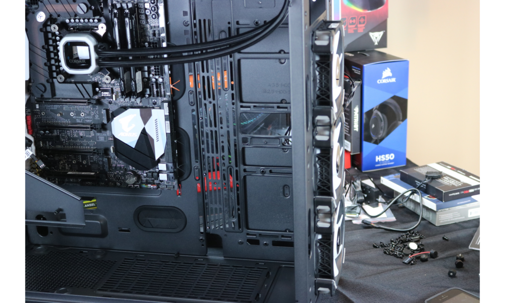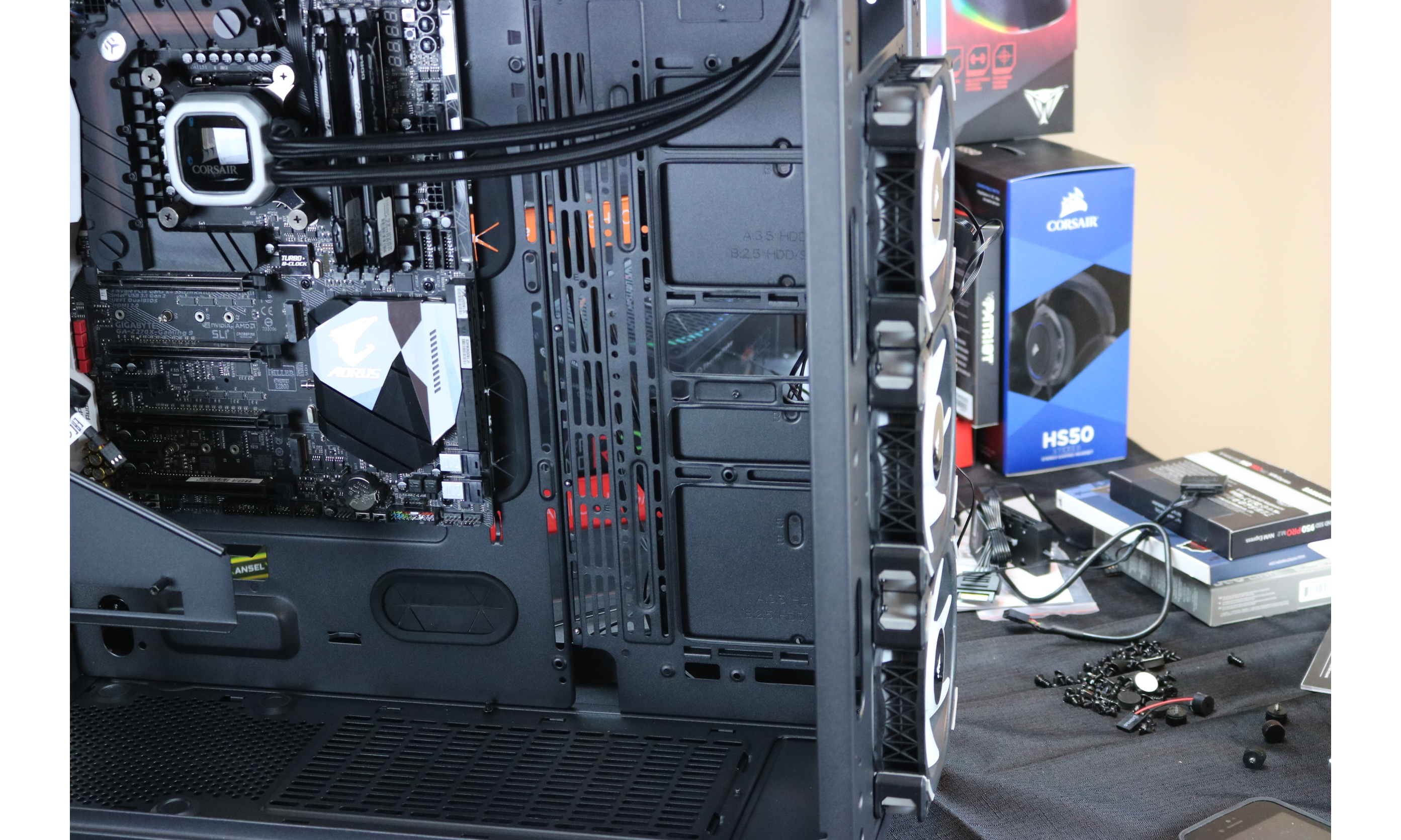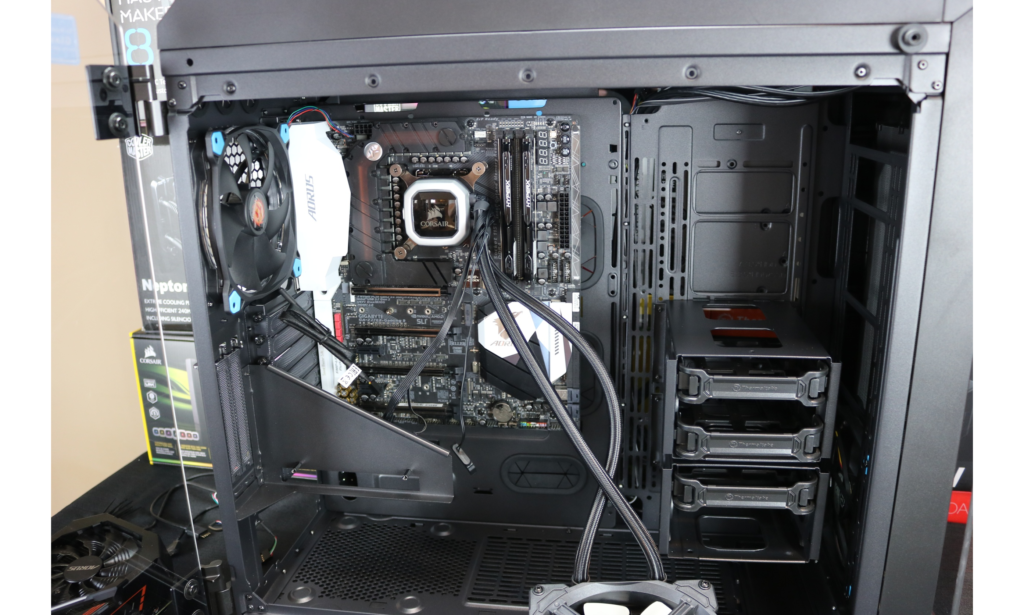 Starting off with our motherboard, we had no issues with the installation. We found there was just enough room to be able to stick our large fingers up top left to hook up the CPU power as well as the rear IO color cable. On the top we installed our three fans including two for our AIO radiator and one for an extra exhaust. Installation was simple with the removable tray.