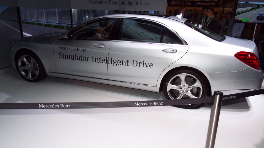 The next auto manufacturer display we visited was that of Mercedes-Benz. Benz has created what amounts to a self-driving luxury vehicle with the F 015 Luxury in Motion research vehicle. This vehicle illustrates how the car is growing from a mere form of transportation into ultimately becoming a private retreating space and mobile living space. In the image below, the area in front of the vehicle is darkened to allow the driver to see the display wall of the demonstration to get a true feel of what a self-driving vehicle is capable of.
