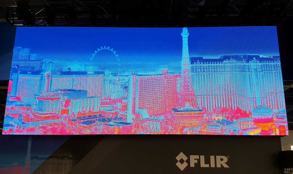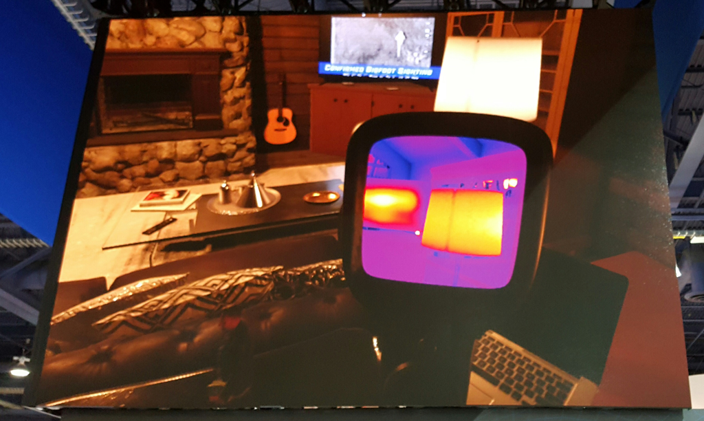 The image below shows the view that a young lady at the Flir booth sees through the VR headset display as she is tasked with locating certain objects in the room shown on the big screen. The inset picture is her perspective as she looks around the room for the objects. We would have liked to have tried the demo, but the line was (not unexpectedly) rather long.