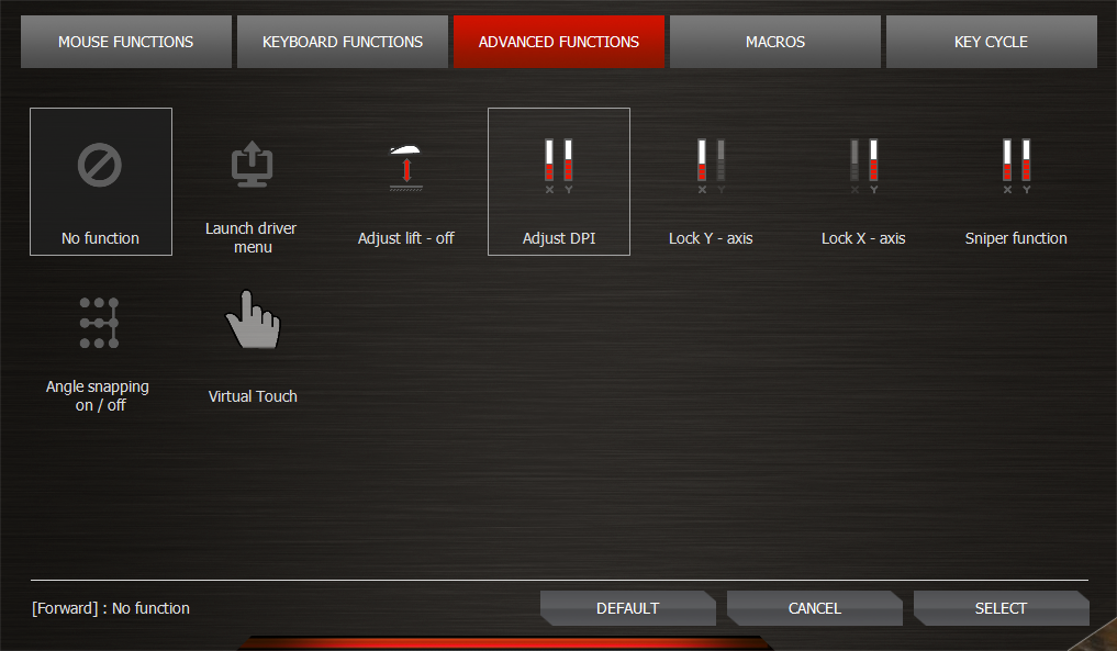 Some of the advanced functions you can choose from are what we have displayed above. Launching the driver menu is an easy way to open this software and we have programmed that as our “7” key and already comes in handy while writing this review. This is also where you will be able to customize your “sniper” button which will drop your DPI to a personally selected DPI, adjustable individual axis’. It is pre-programmed as the “8” button and works great there but is not limited to this spot.