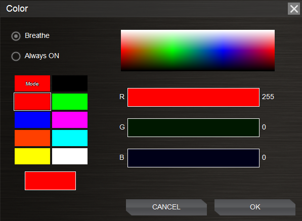 From the customize setting you are unlimited in colour but very limited in effect. Unable to choose from anything other than Breathe or Always ON, you lose out on some of the other effects you may be used to, such as blinking or adjusting your own specific colour wave. Also, the duration of the breathing effect is not adjustable. For such amazing and easy to use software as we are working with here we feel a little more customizing on the lighting effects would have been an added bonus.