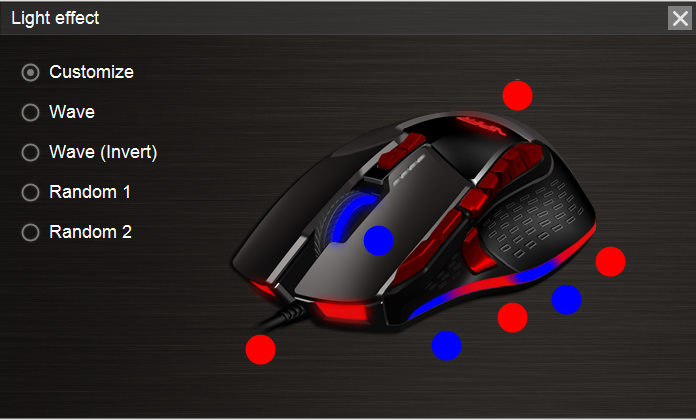 When you first enter the light effect menu by clicking the RGB colour wheel at the top right you’ll be opened to the page above. Giving you the option of the five noted above, only one, customize, is adjustable. While we have a few things to say about that don’t be set back we are sure you will appreciate the colour schematics that are supported regardless.