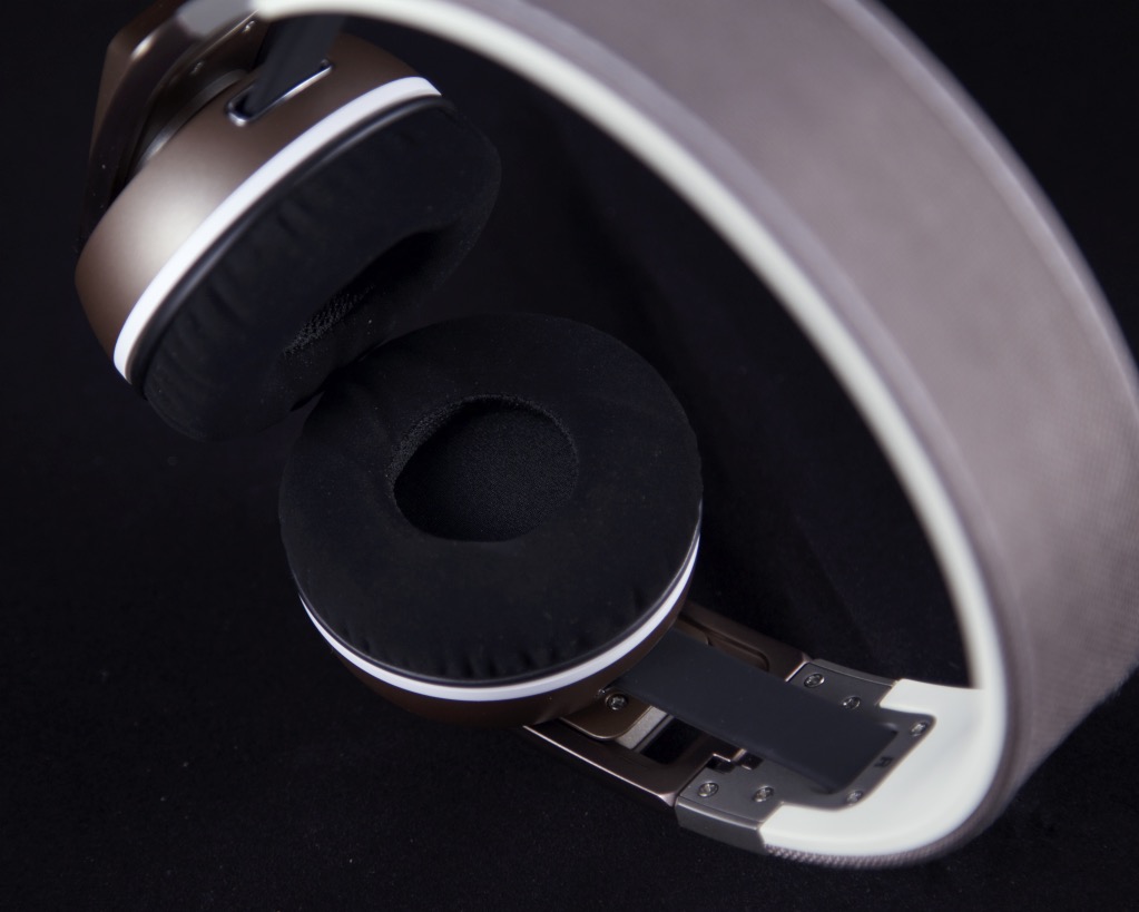 Let’s take a closer look at the on-ear headphones themselves. Our sand coloured headphones feature a soft rubber on the interior of the headband, and a fabric-like design on the exterior.
