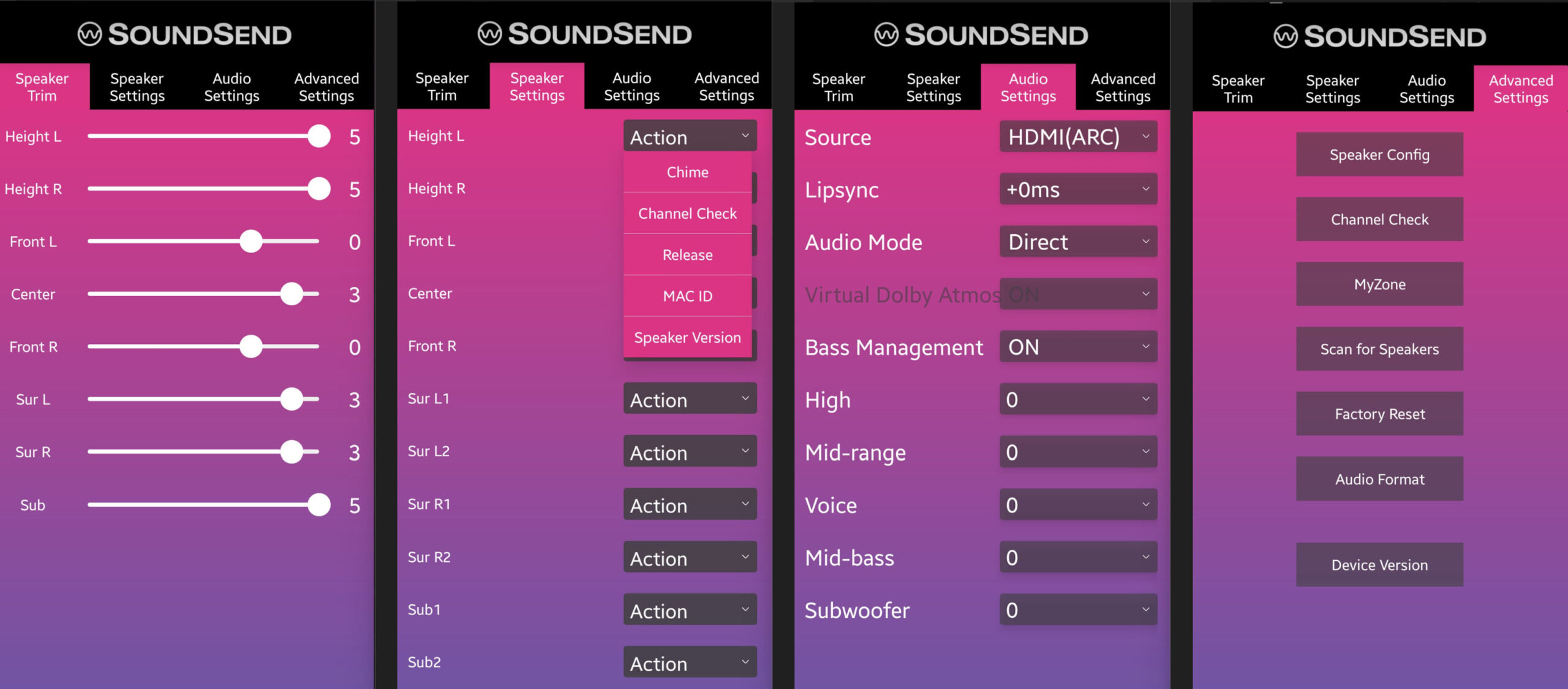 The Advanced Settings menu has Speaker Config for specifying your specific configuration (2.0/7.1/5.1/5.1.2/etc), Channel Check to confirm each speaker is working and in the right place, MyZone which allows you to identify speaker distance, Scan for Speakers, Audio Format which identifies the format being pushed from the TV, along with Device Version.
