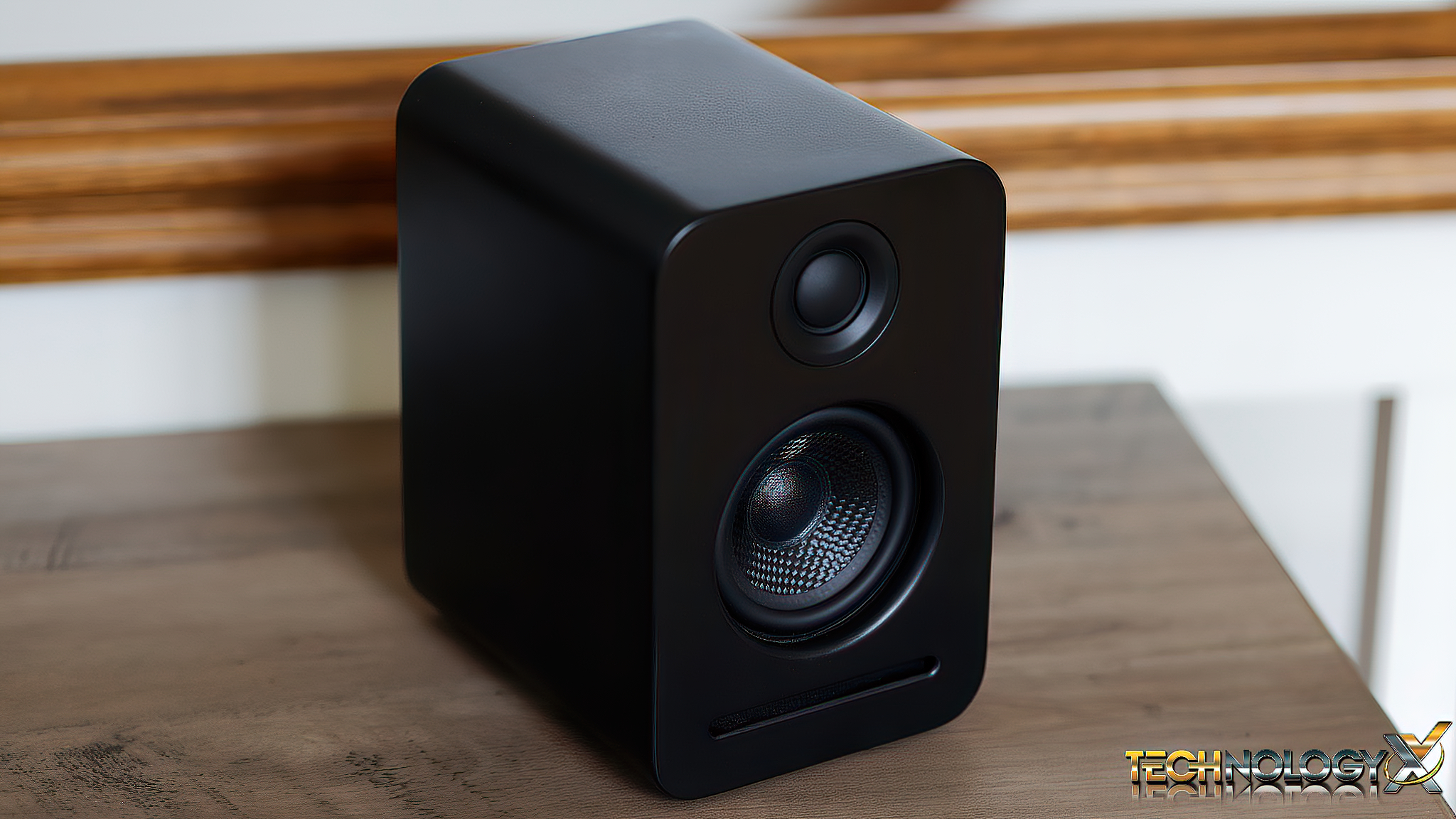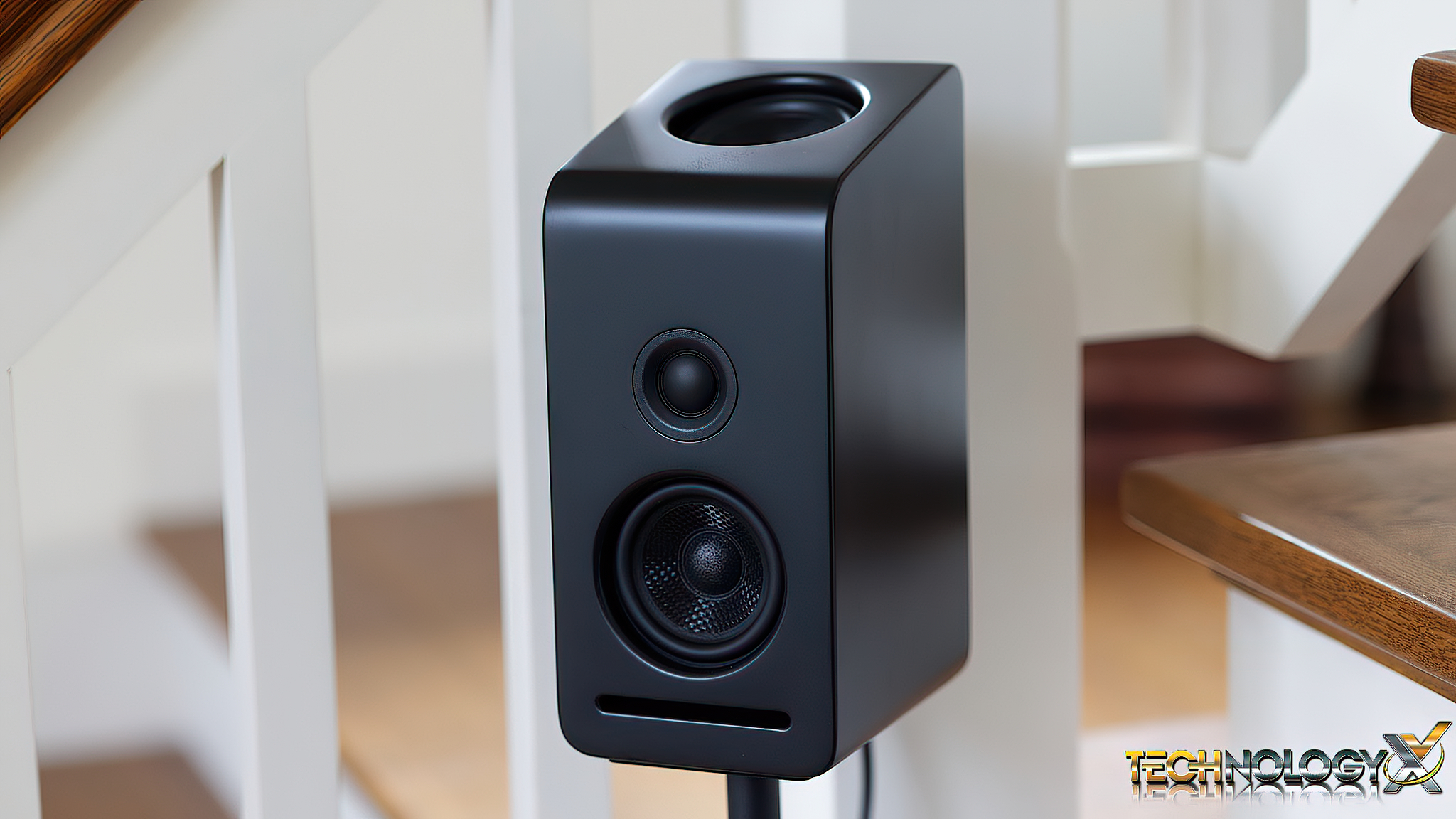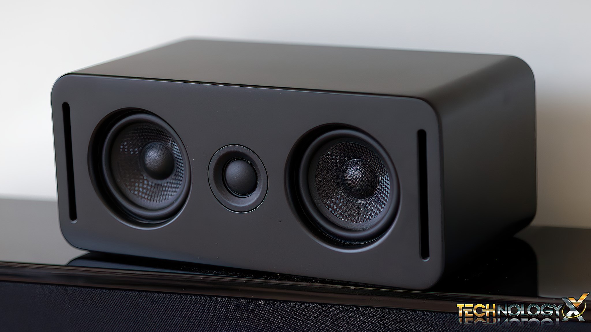 The two front speakers measure 9.5″ x 4.3″ x 5.5″ and contain one driver and one tweeter for the front left and right speakers, along with another up-firing driver on each speaker for Dolby Atmos applications.