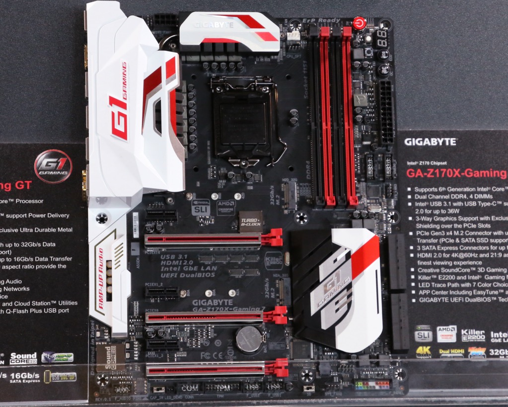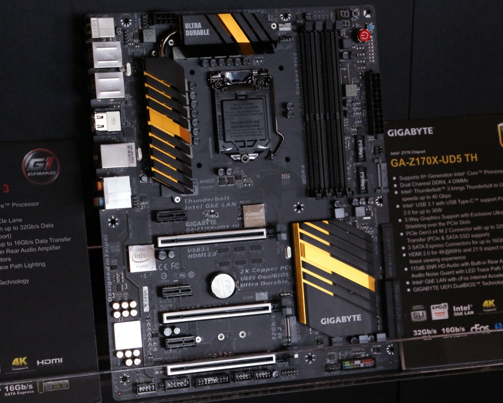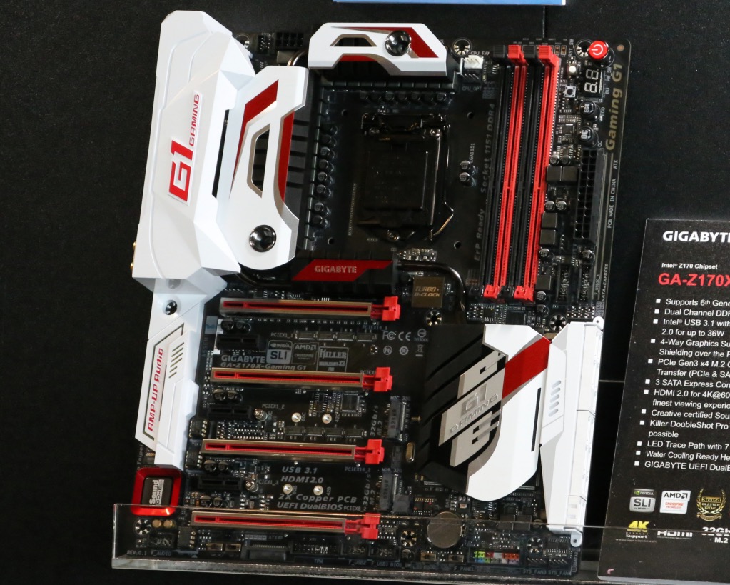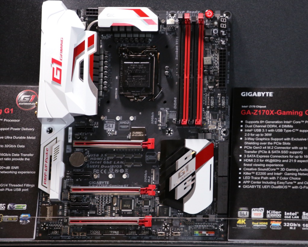Introduced here at Computex was the new G1 Gaming line of motherboards, ready and capable for Skylake. On display was the GA-Z170X-Gaming G1, GA-Z170X-Gaming GT and GA-Z170X-Gaming 7. Also on display was the Skylake ready Ultra Durable GA-Z170X-UD5 TH.