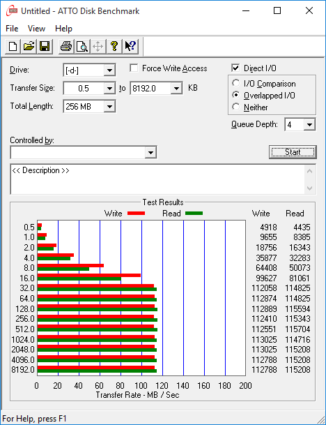 Our first benchmark test yields fairly decent results, as the HD720 pumps out a max read speed of up to 115 MB/s and a max write speed of up to 113 MB/s.