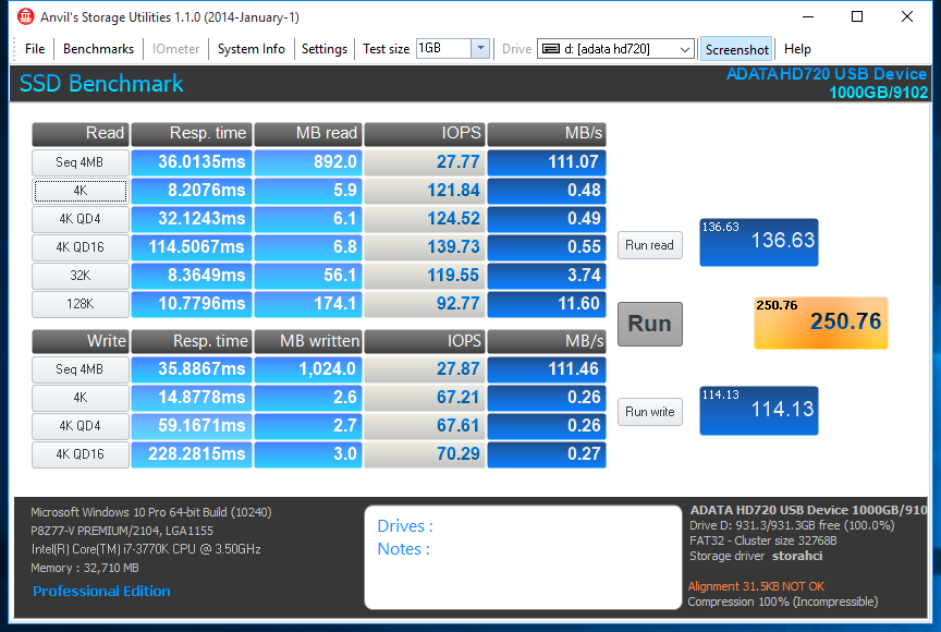 Anvil Storage Utilities is essentially an all-in-one tool for all of your SSD benchmarking needs. Anvil can be used for basic consumer testing, as well as endurance testing and threaded I/O read, write and mixed tests. It displays data regarding the SSD, and even about your system
