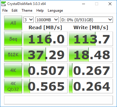 With Crystal Disk Mark, the sequential read speeds come in a little higher than our ATTO benchmark, at 116 MB/s and a max write speed of up to 113 MB/s.