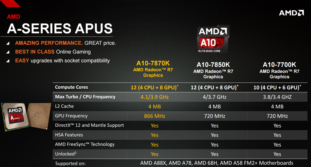 The A10 7870K is very similar to the A10 7850K, except clocked at 3.9 GHz and 3.7GHz on the CPU and 866MHz and 720MHz respectively. The A10 7870K is priced at $140 and the A10 7850K is priced at $125