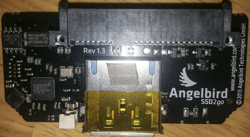 Speaking of the USB 3.0 to SATA 3.0 + power bracket, as we will see from tests later on, this is a custom conversion adapter proprietary to Angelbird. We have the ATMEL 1150 USB 3.0 JTAG ISP programming chip, as well as the ASMEDIA ASM1053 and ASMEDIA ASM1456 processing units: