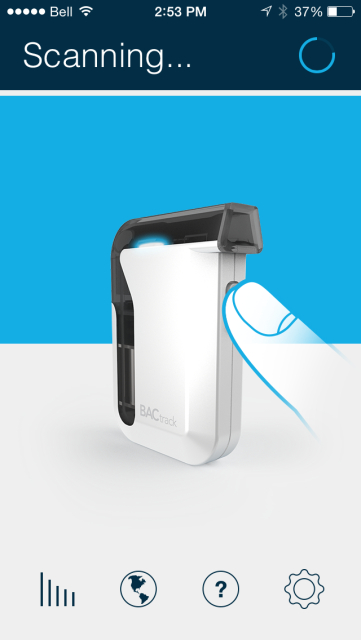The BACtrack application for iOS and Android is the next necessity to look at. The app has a very simple UI, with the device appearing on the main screen, which takes up most of the screen space. Below that you will find four different menus;