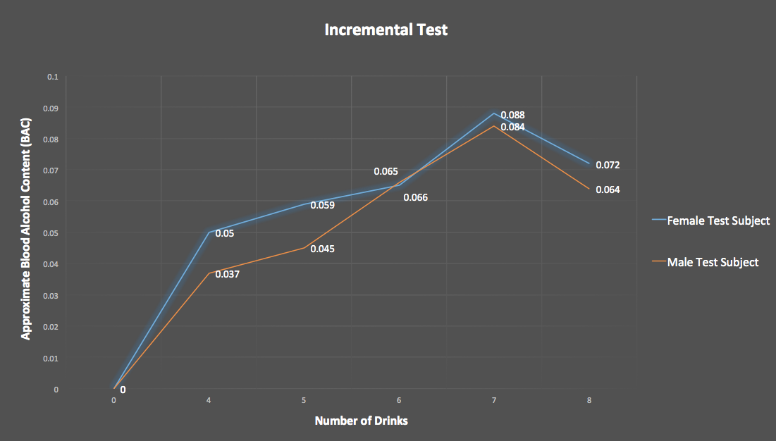 As we spoke about earlier, for the incremental testing the two test subjects simply drank one beer per hour, and introduced a shot at drink number seven. This was to identify how the blood alcohol content would change based upon a standard consumption over a certain period of time. We introduced a shot to our testing to ascertain how much the BAC would alter with a higher percentage alcohol. The graph below indicates how the test subjects’ BAC changed over time.
