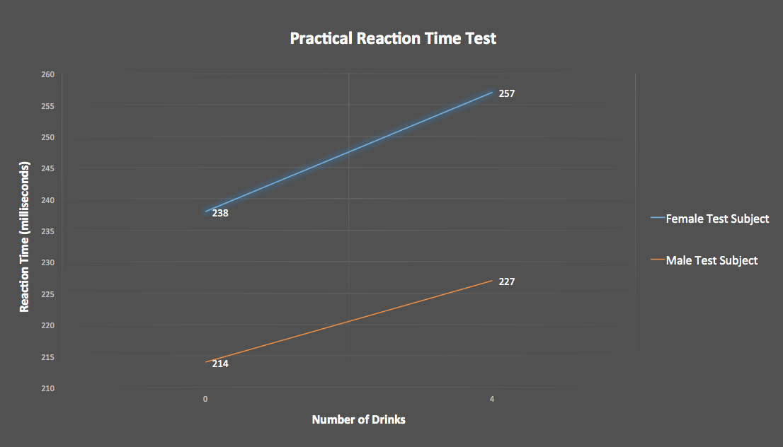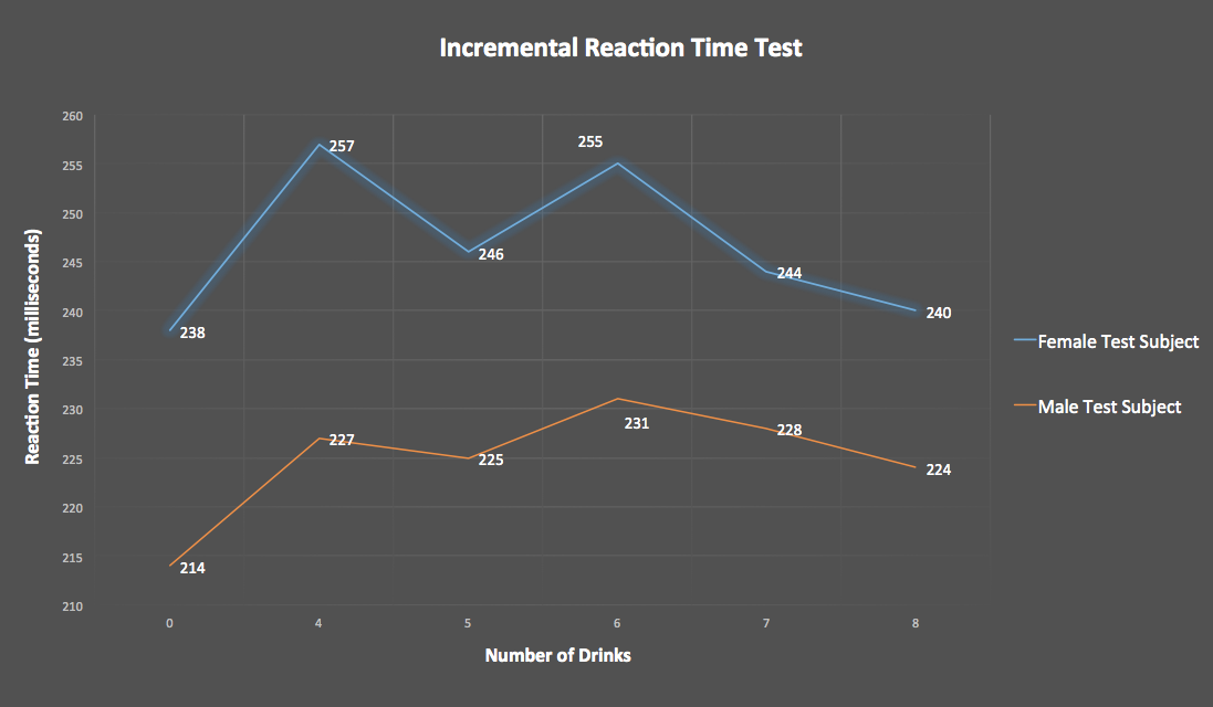 The female test subject experienced her slowest reaction time at drink number four, followed closely by drink number six, with an increase of 8% and 7% accordingly. The male’s reaction time, while experiencing a general slow down, didn’t dramatically change over time. With the slowest reaction time found at drink number six, followed closely by drink number seven. Interestingly enough, our male test subject also saw an increase in reaction time by 8% and 7% accordingly. Another interesting point to be made is at drink number seven, which was the inclusion of a higher percentage alcoholic beverage (the inclusion of one shot), the reaction time didn’t change dramatically.