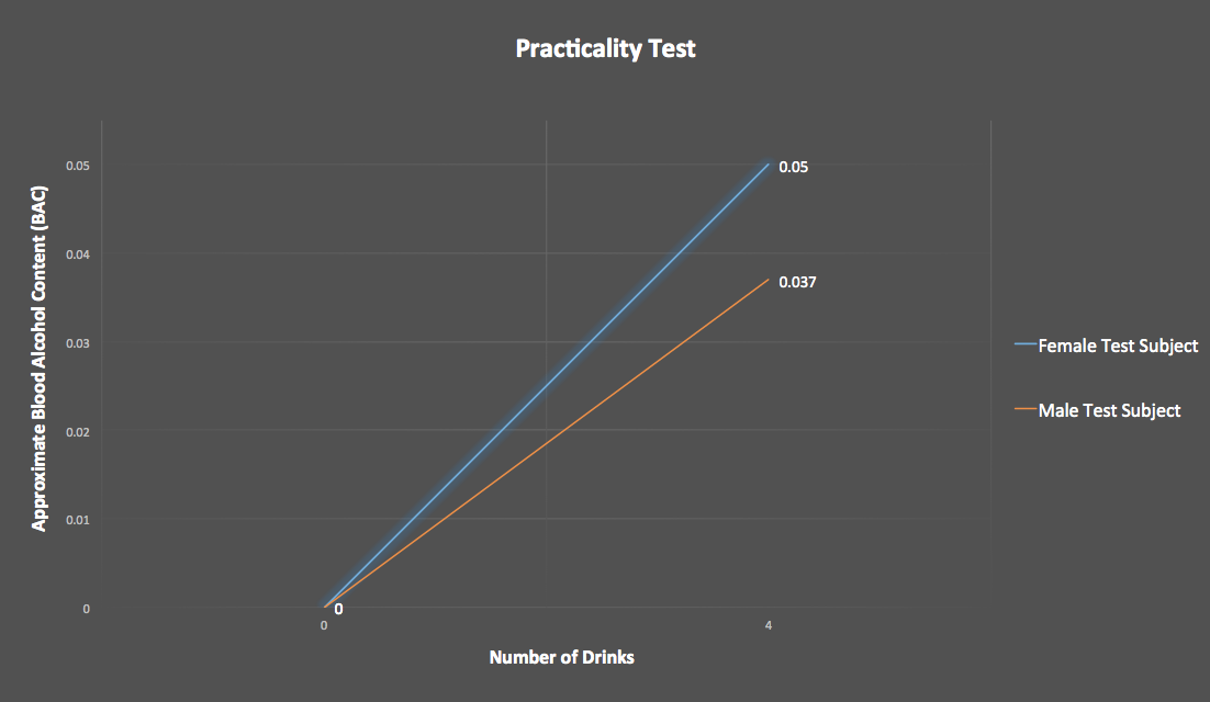 As we said above, the two test subjects went our for a common dinner: pizza, wings and beer. Each subject consumed four beers each that had an alcoholic percentage of 4%, over the time span of approximately an hour and a half. Prior to leaving for dinner, each test subject tested the breathalyzer and reaction time, this was to set the control for our testing. Immediately after the dinner, tests were performed again. The graph below showcases the change in blood alcohol content in both test subjects.