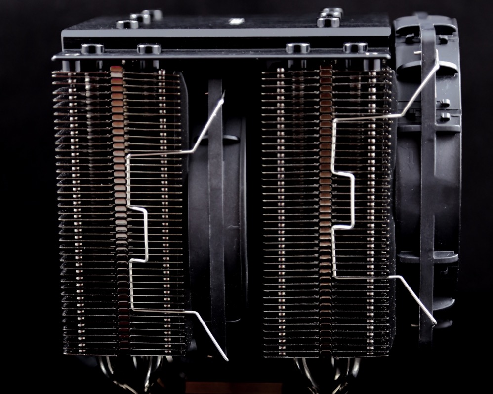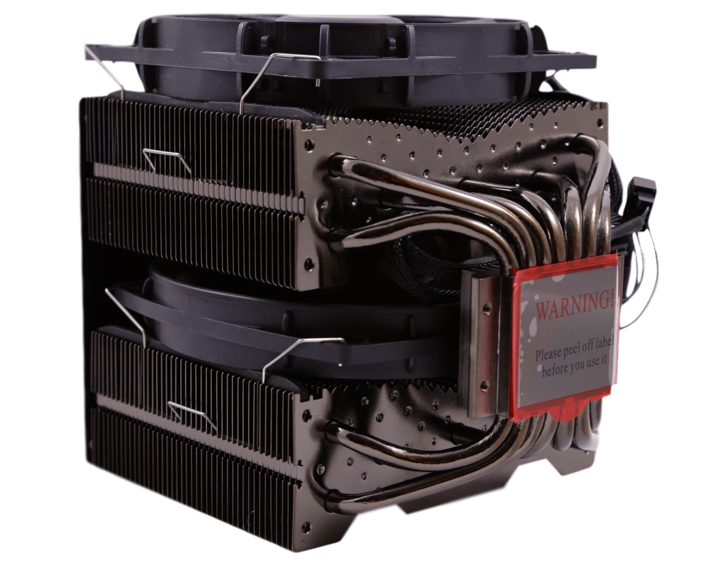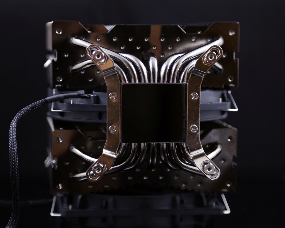 The heatsink features a fairly square/cube design that is asymmetrical. There are seven aluminum /dark nickel-plated heat pipes at a diameters of 6mm each. All of which stem to the copper CPU base. Be warned, there is a plastic sticker on the bottom protecting the mirror finish for the CPU base. It is far to easy to leave this on, which is highly unrecommended.