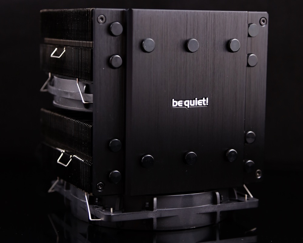 The top of the cooler features the be quiet! logo, stamped into the black brushed aluminum finish.