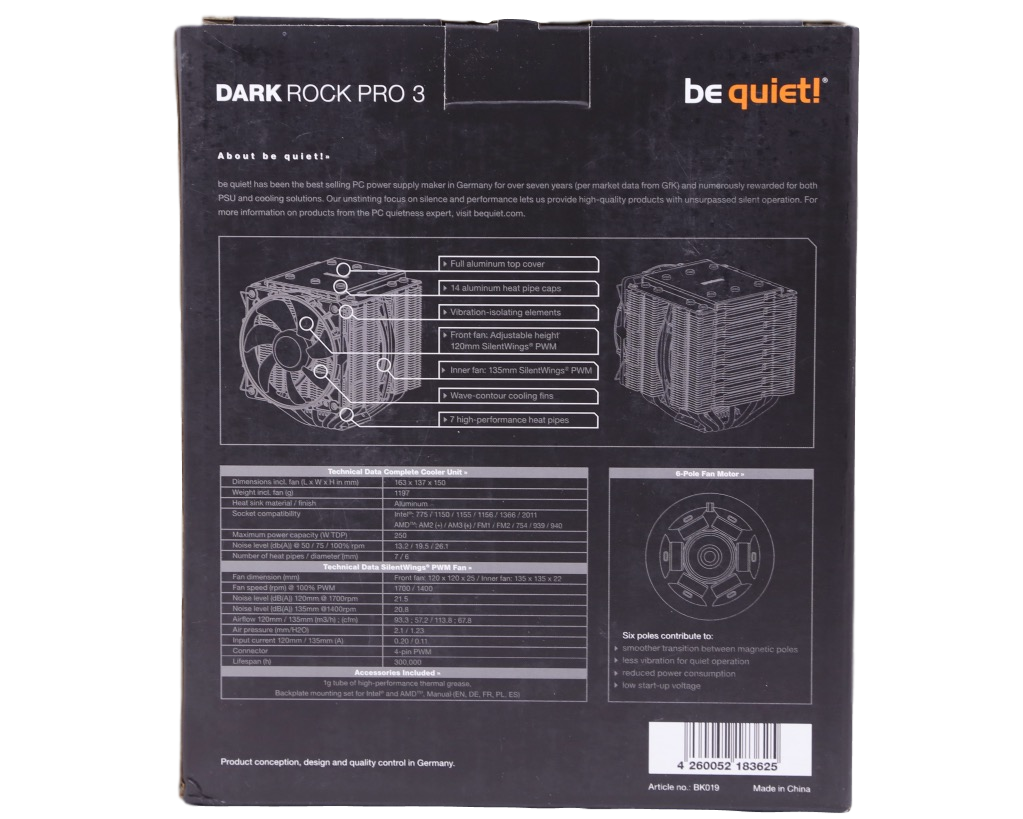 Taking a look at the exterior of the packaging, this giant cube provides us with a quick view of the key features and specifications. On the front of the box, be quiet! has even included a sleek first-look at the CPU cooler.