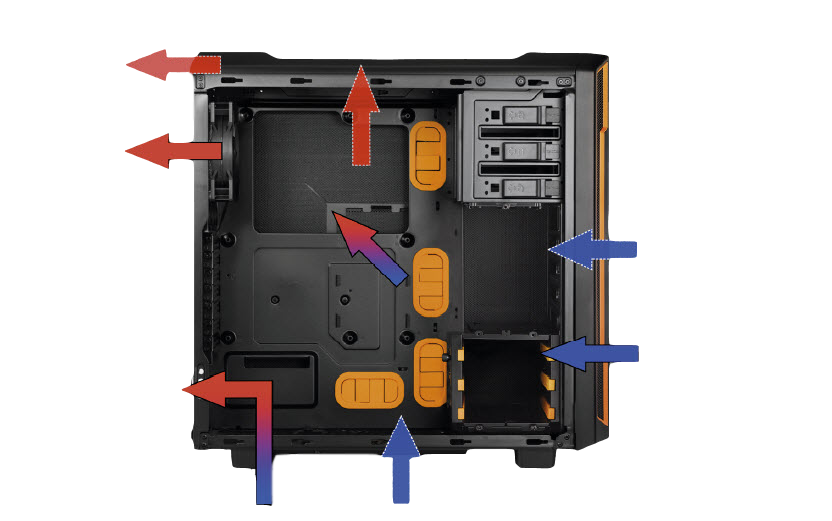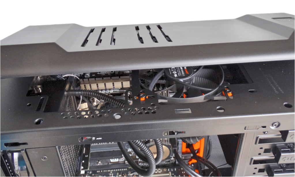 Once we placed the panel back on we noticed that the air slots are better suited for a rear top fan but still are functional. We advise only using the top for exhaust as the top is the only area that doesn’t come equipped with removable dust filters so if set up for intake you will have quite the mess of dust inside which is undesirable anytime.