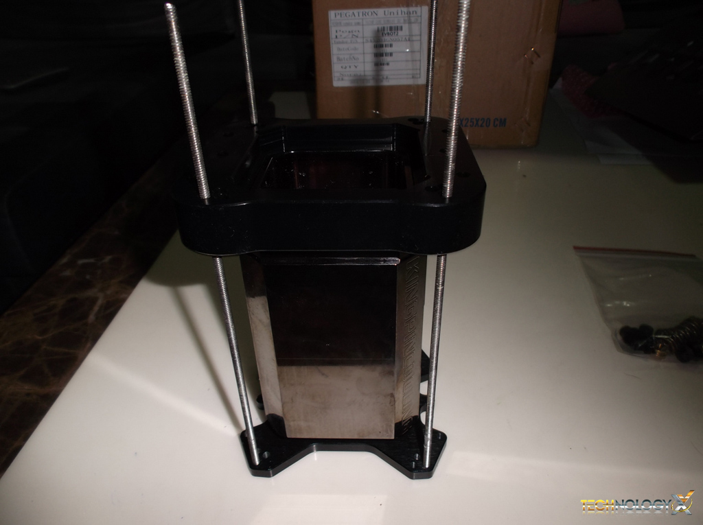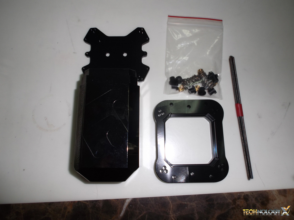 As you can see, the pot comes with backplate, mounting rods and mounting hardware to screw the pot down much like with standard cooling hardware. The pot is also modular, which means it comes in two pieces, the copper base and the top.