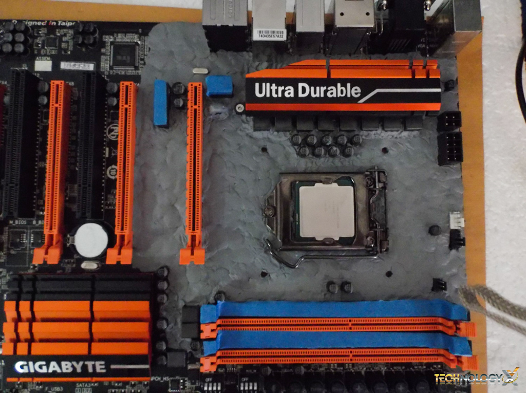 As you can see in the following pictures we have used a kneadable art eraser to insulate the Board’s top side. Underneath the board we have used Vaseline to insulate, using a paint brush to spread the Vaseline over the socket half of the board and seal it by using a hairdryer. Other methods include conformal coating on both sides of the board, but on the topside can be tedious as you need to cover all slots plus CPU socket so they don’t get the coating on during spraying. Just think of spray paint as an example. Liquid Electrical Tape can also be used on both sides. We have also used blue painters tape to cover the unused RAM slots, the first PCIe slot and PEG connectors to protect those areas against condensation.