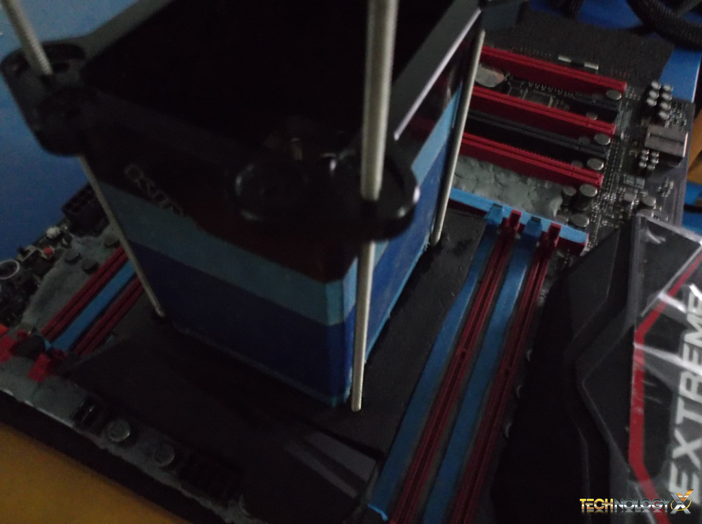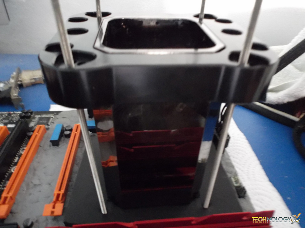Pot mounting is as easy as mounting any cooler on your motherboard, even GPU pots are easy to mount. As you will see in the following pictures we have used a quarter inch piece of closed cell foam as a gasket to help the cold be more directed to the CPU as well as a nice seal of the socket area. Below is the the Venom pot mounted on a Rampage V Extreme.