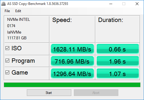 AS SSD Benchmark uses incompressible data in their testing of SSDs, essentially providing results that would be consistent with using the heaviest workload, thus lower speeds are expected. Transfer speeds (MB/s) are seen in the left picture below and IOPS (Input/Output Operations Per Second) are on the right.