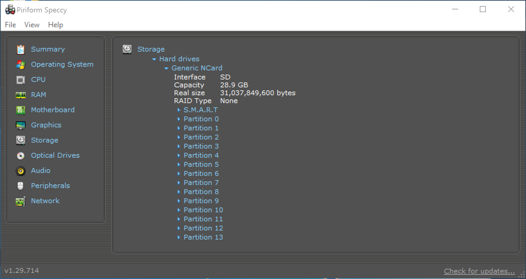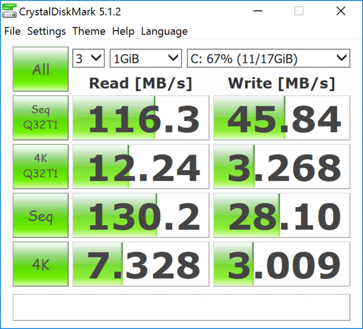 Speccy let us know that we had an SD card as our internal storage. Not exactly what we may have envisioned considering all of the other options that could have worked with ease. In any event, the internal storage reaches a max read speed of 130MB/s and a max write speed of 28MB/s. Not quite what some may envision as a speedy storage device, especially for Windows.