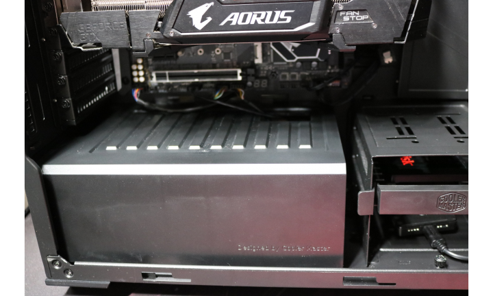 The drive tray here was used for two specific reasons. One reason was to hold our 2.5 ” dive and the second was to house our Cooler Master RGB controller for our fans. It was a great place to put the controller as it is almost out of view but still accessible. Right next to the drive tray is a huge amount of space to run cables through.