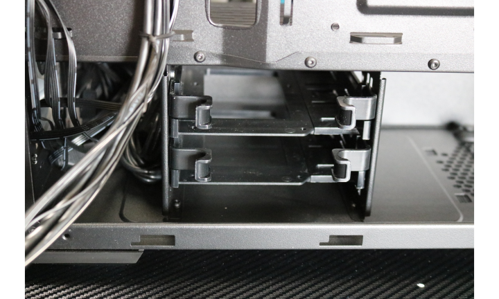 Cooler Master has told us that this front panel can hold up to a 280 mm radiator for an AIO, however we are going to push the limit of this chassis and install a 360 mm one instead. Just to the left off the front intake radiator area is the quick release 2.5 ” mount. Unfortunately this is the only area for a 2.5″ to be mounted without ordering extra mounts from Cooler Master.