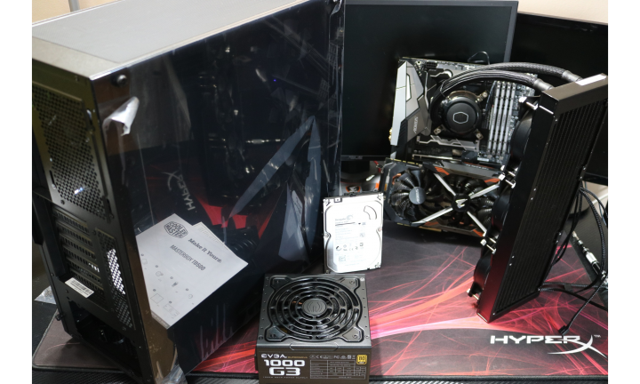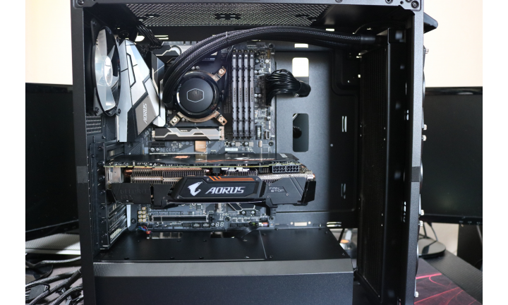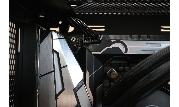 In the confines of the chassis we installed our motherboard along with our Cooler Master 360 mm AIO. We had to install the standoff screws as they did not come pre-installed. Our radiator fit in perfectly. Weird how Cooler Master products fit well with other Cooler Master products!