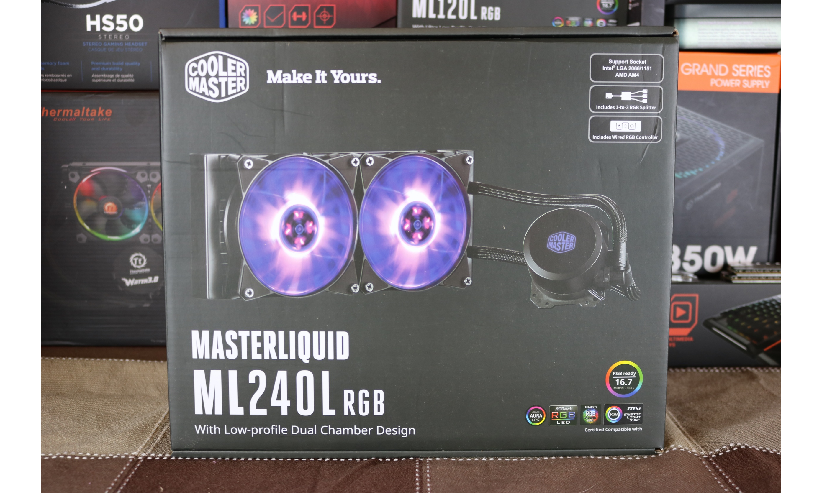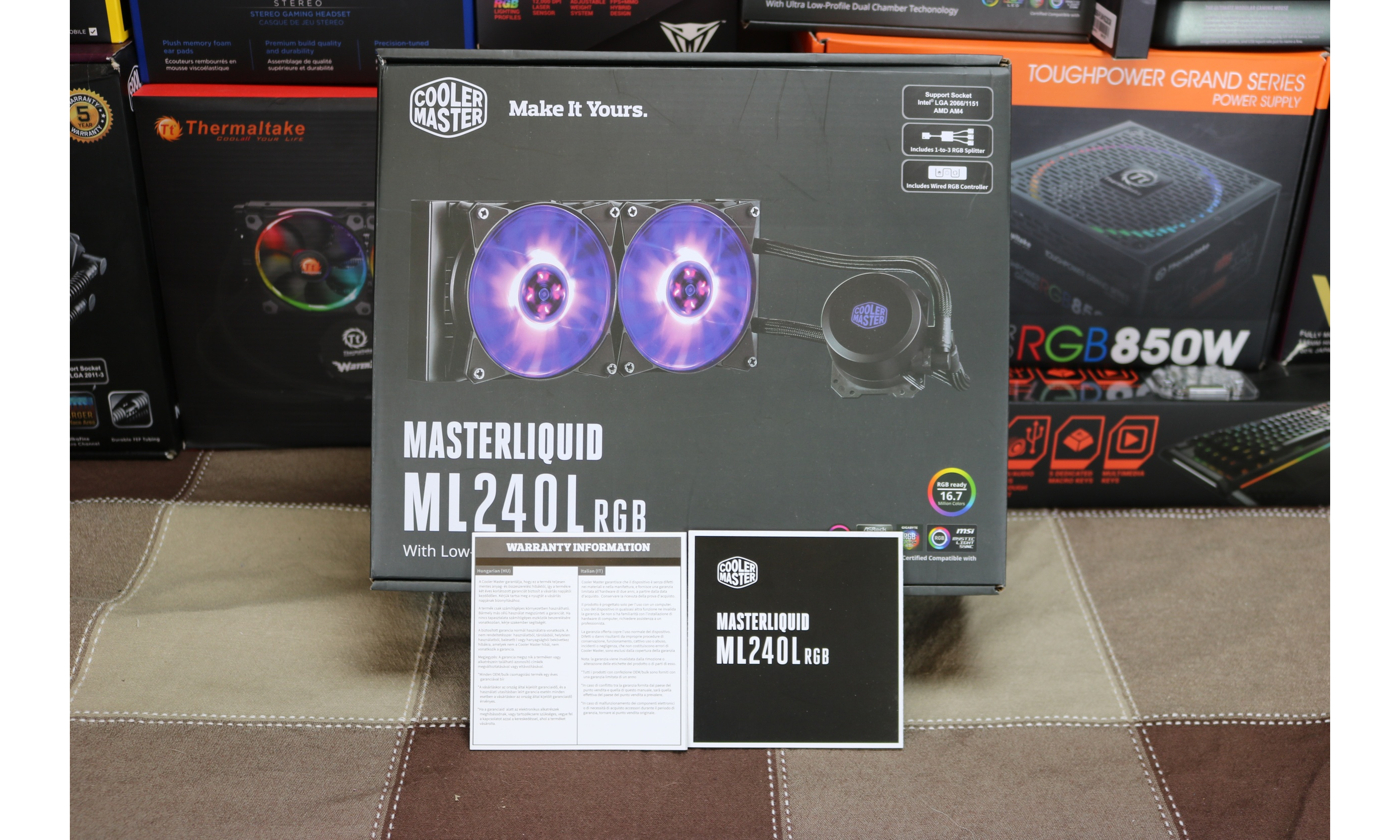The ML240L comes equipped with an RGB splitter to connect the fans as well as the logo to on-board motherboard color software. If the software is not present, Cooler Master throws in their own in line controller.