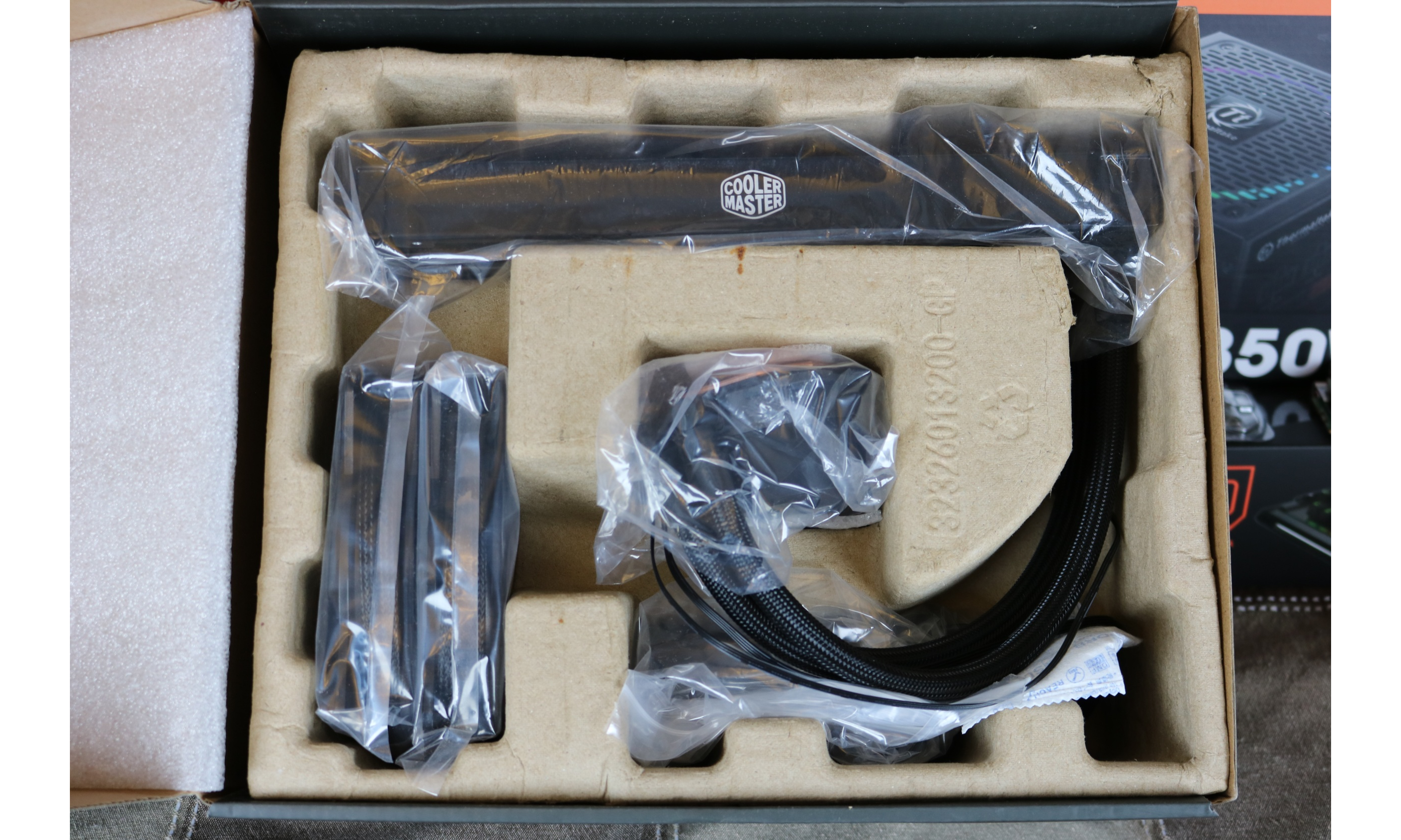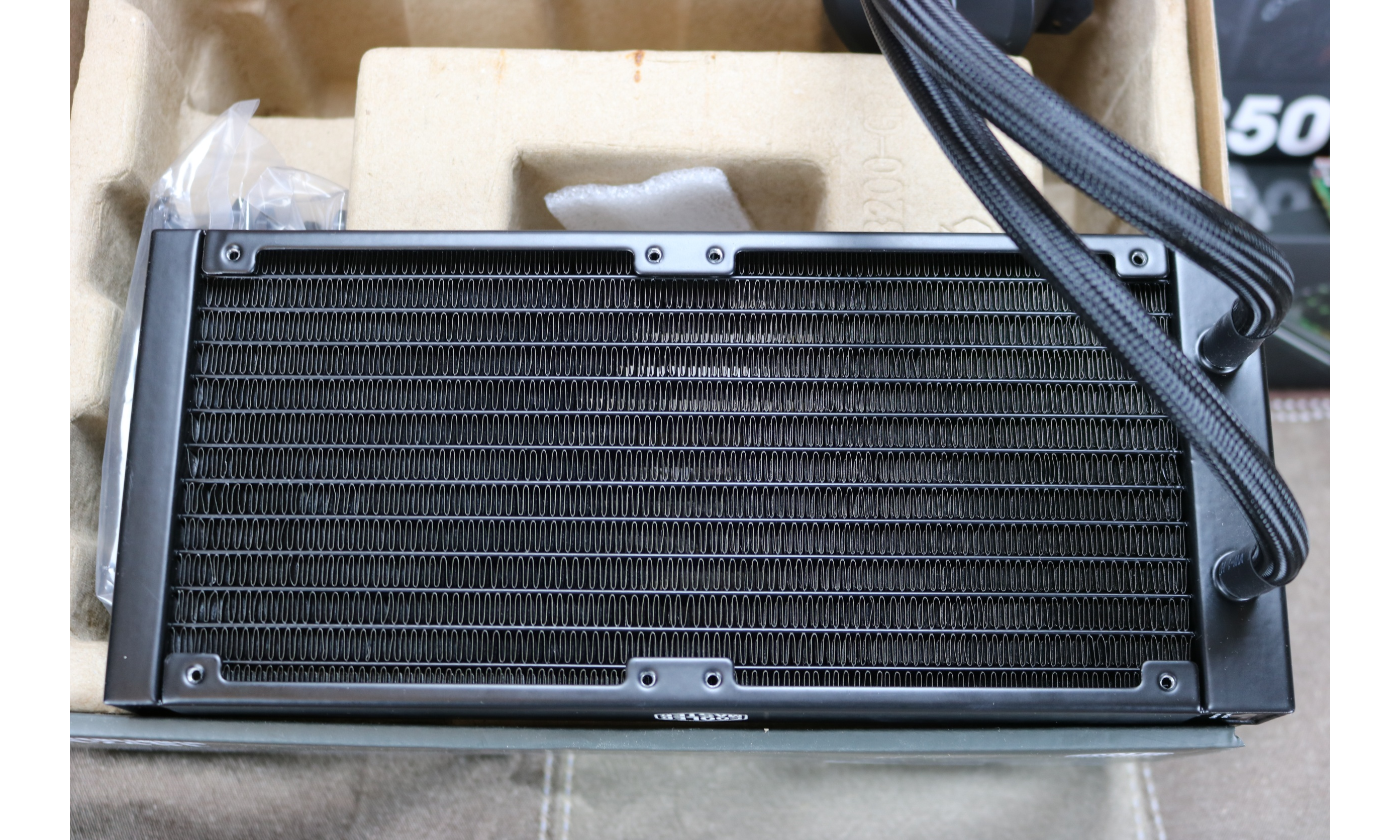 Moving to the inside we see the slotted cardboard mold with all the crucial parts wrapped in plastic, including the radiator, two 120mm RGB fans as well as the pump and copper face.