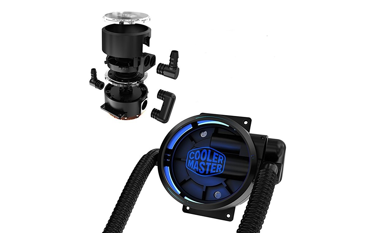 The RGB Cooler Master logo on top of a professional looking black pump is very appealing to the eye and implements a dual chamber design which we will touch on later.