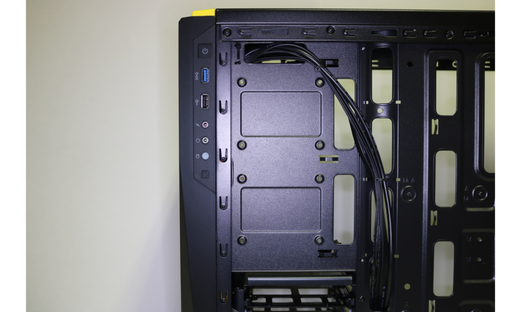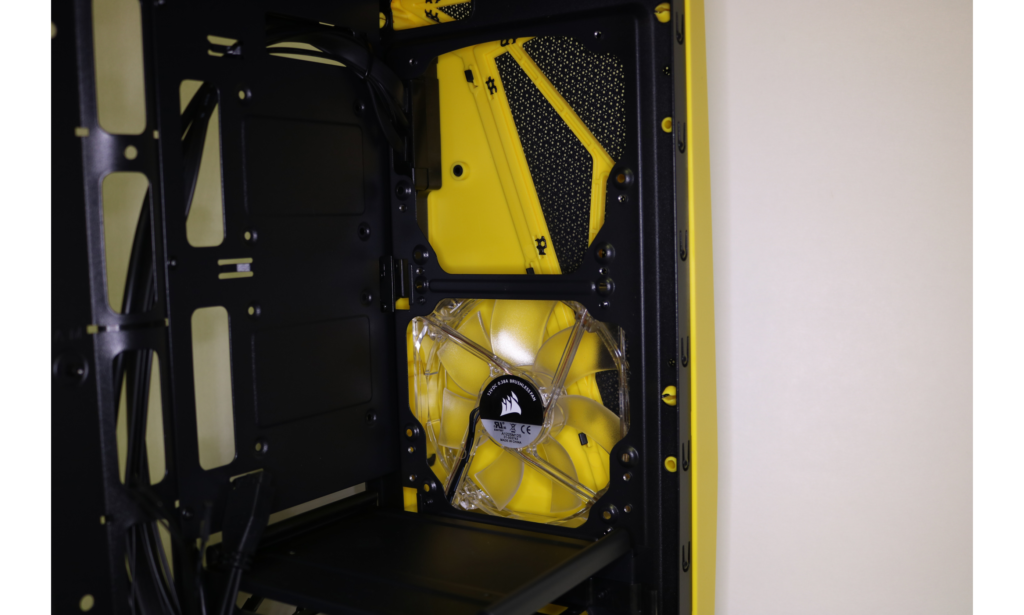 The Corsair Carbide Spec-04 does a very standard job with providing enough vents. Two 120mm or 140mm fan spots are located in the front right behind the yellow vent panel. Our build will more than likely put two intake fans in that location.