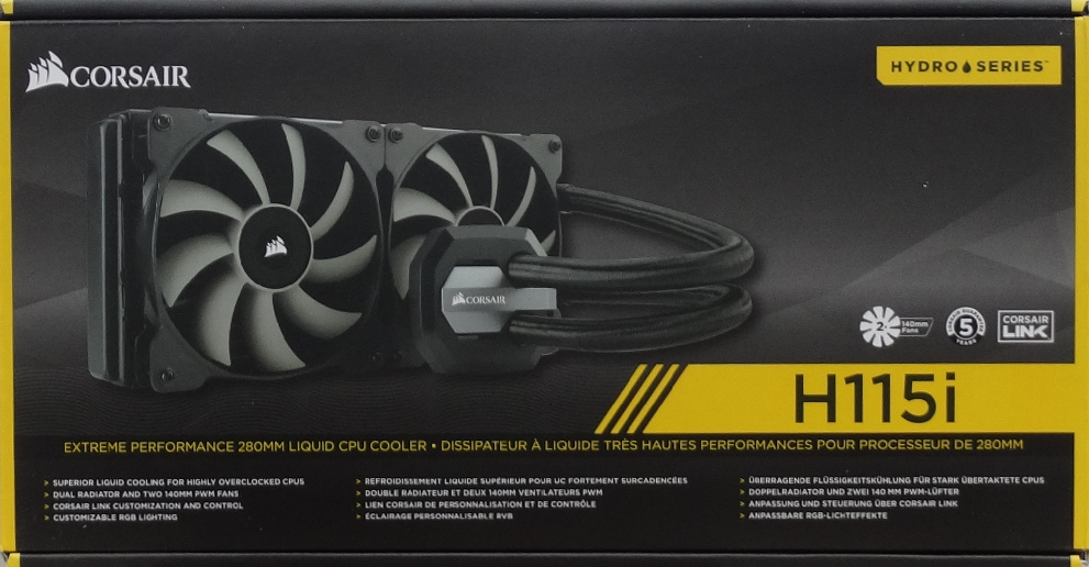The retail ready packaging of the H115i is predominately black with yellow accents. The top of the package is the main face and proudly displays the bold H115i name as well as the unit itself. On a starting note level we think they need to give an actual name to the unit, labeling is an easy way for word of mouth to spread about your product and well “H115i” isn’t really a catchy name. Not a major flaw but definitely some food for thought. This large 280 cooler comes in a quite a large box with plenty of surface area to advertise everything this unit contains.