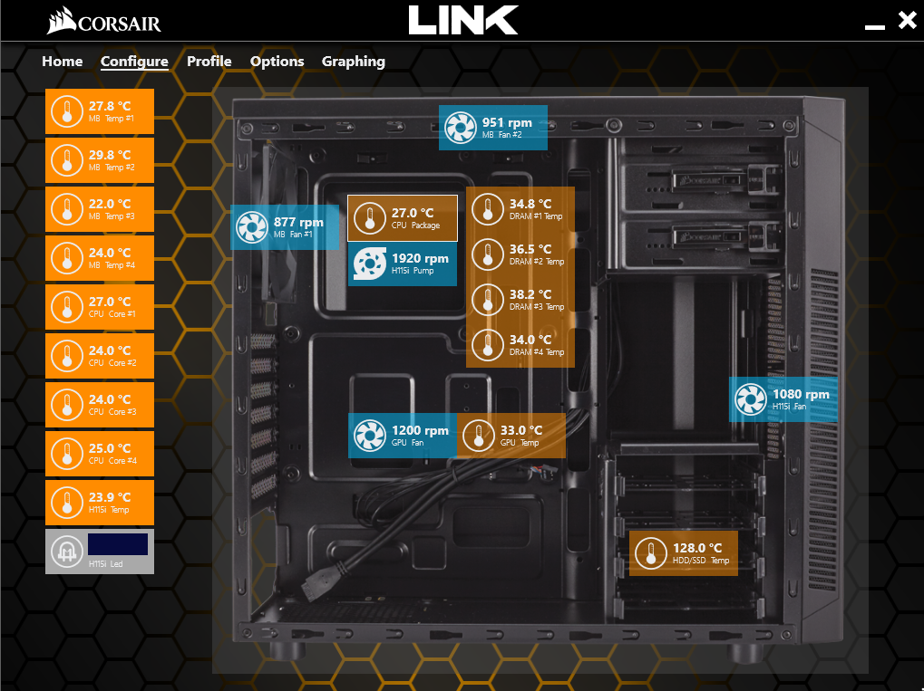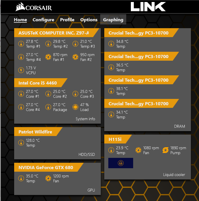 Performance: which will run your Corsair connected fans at 138rpm and the H115i pump at 2910rpm;
