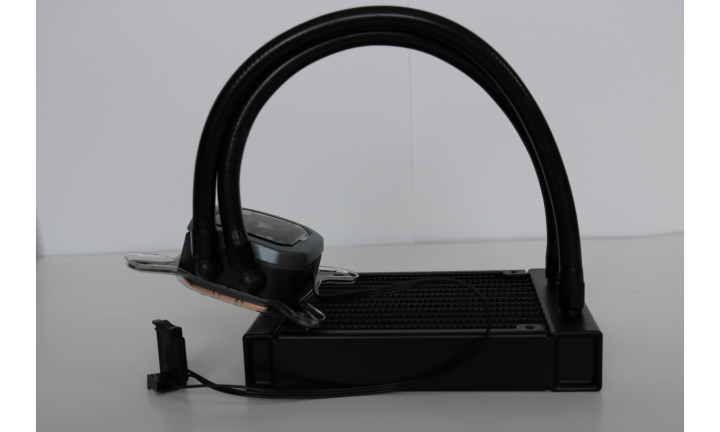 The main tubing connects the radiator to the copper low-noise pump. The pump is a step up from the previous version of this cooler offering white LED support which is powered by the sata power cable. On the latter side of the firm rubber tubing is the aluminum slim designed 120mm radiator.