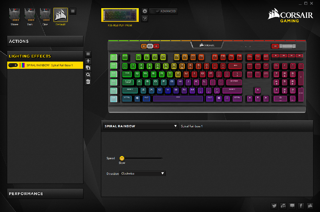 Starting at the top left you’ll notice the four tabs, three resembling SD cards. These are your hardware profiles and anything saved in these will be saved to the 8Mb of on board data. The default profile is beside those and this will be the running profile when CUE is not in use. If you have any other CUE enabled devices hooked up they will show up at the top beside the Keyboard and you control them simply by clicking on them and adjusting their options.