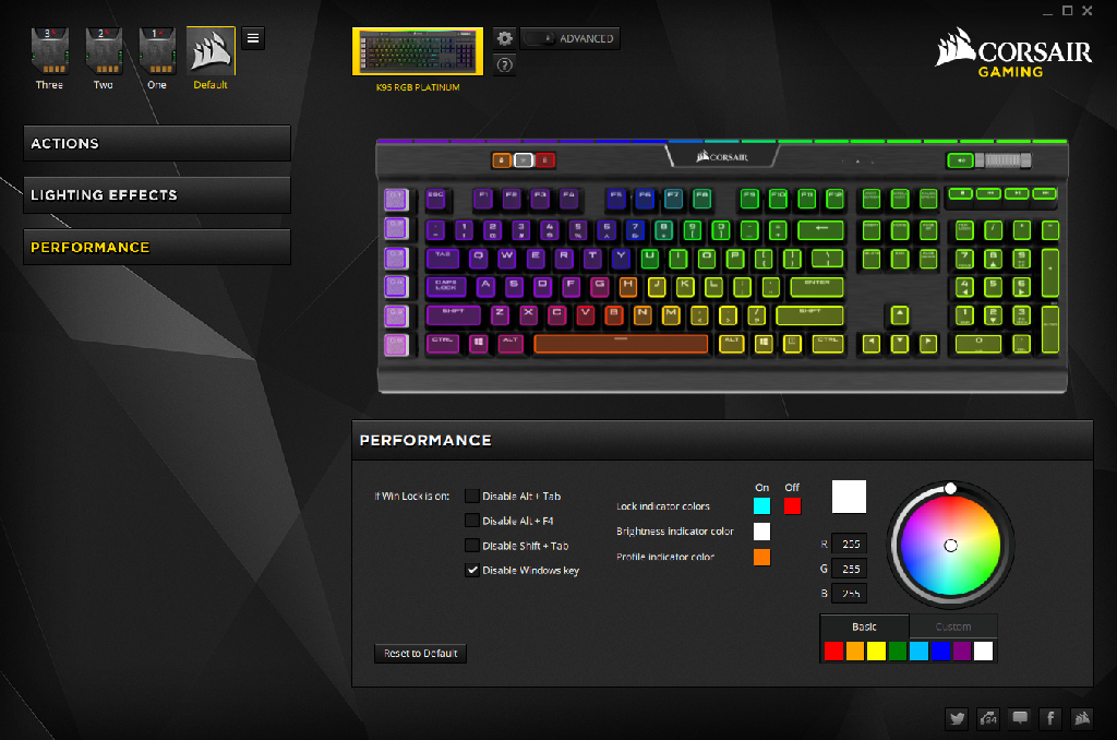 The final tab is the Performance tab and will allow you to control the function of the Windows Lock button. Disabling certain functions of the keyboard to keep you from messing up mid-game with an accident Windows key tab. Also, the colour wheel will allow you to control the lighting of the Profile/Brightness/WinLock keys.