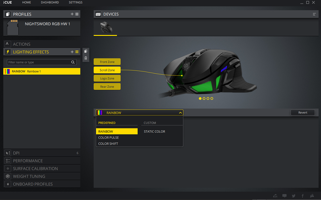 The lighting effects panel breaks down the mouse’s RGB lighting down to four zones: Front, scroll, logo, and rear. Playing around with these you can make some pretty nice effects and it can completely distract you from your review for an hour before anyone notices.
