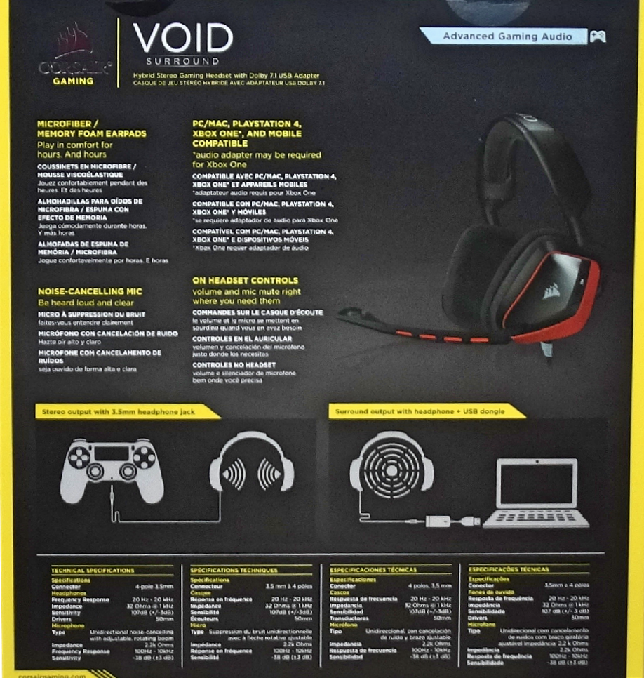 The packaging on the Void follows that of the rest of their gaming gear, such as the K65 Rapid Fire Keyboard we recently reviewed. With a mainly black box lined with a yellow border the headset sits humbly centered on the front of the box along with a few of the key features the Void possesses.