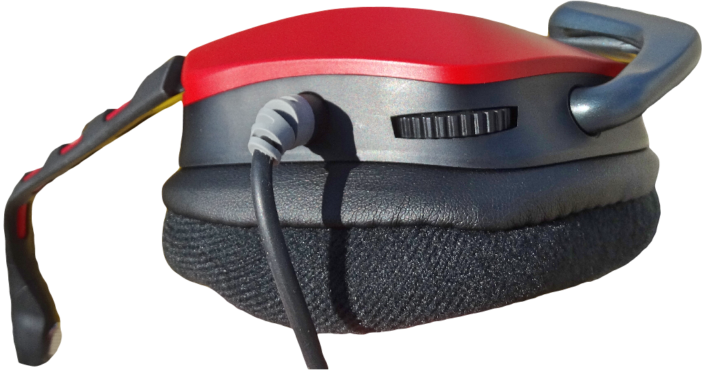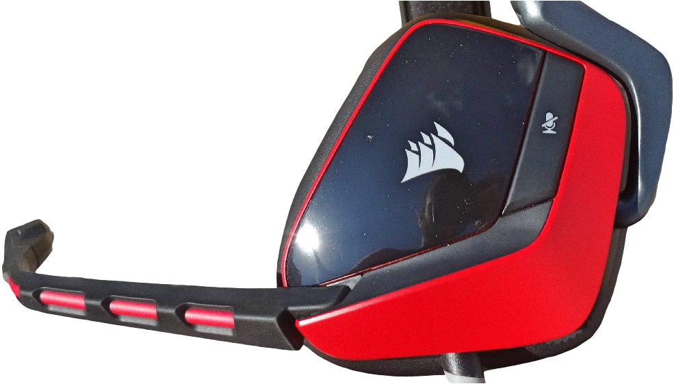 Constructed for the majority out of plastic this headset has a light cool feel to it. Each earpiece is colour schemed red with a glossy black boasting the Corsair logo. There is a long cord that extends from the left ear, which is where all the action on this headset is happening. It has a large mute button as well as a volume toggle at the bottom-back of the earpiece for quick in-game volume control or cancellation.