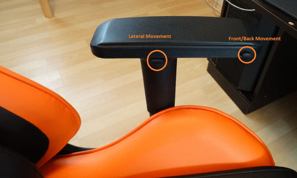 There are two buttons on each armrest which control the placement of the pads individually. One allowing you to pus or pull the armrest into the middle or out to the edges, total travel just over 3 cm. The other controls the front to back motion and gives you roughly 6 cm of adjust-ability.