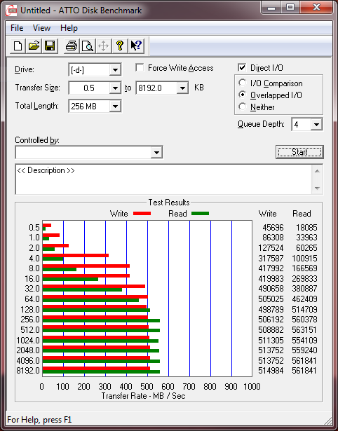 ATTO Disk Benchmark is a relatively easy-to-use benchmark tool, which happens to be the benchmark of choice for many manufacturers. ATTO uses compressible data rather than random data, which results in higher performance and thus, higher benchmark scores. In our testing, we have selected the transfer size to range from 0.5KB to 8192KB, and have set the total length of the test to be 256MB.